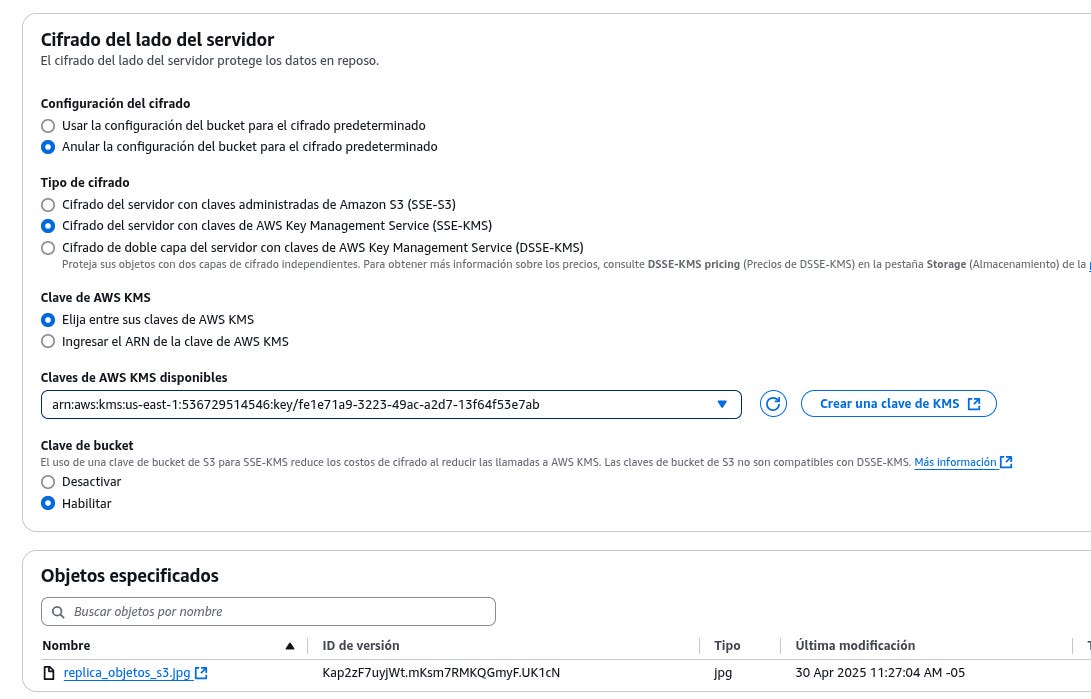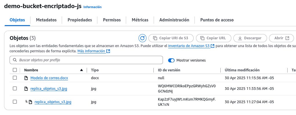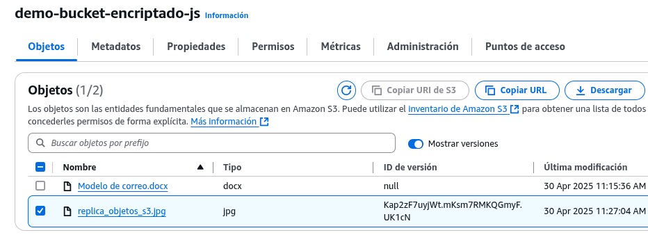 Luego de confirmar el cambio del método de encriptación sobre el objeto “replica_objetos_s3.jpg“, vemos que se ha creado una nueva versión del objeto.