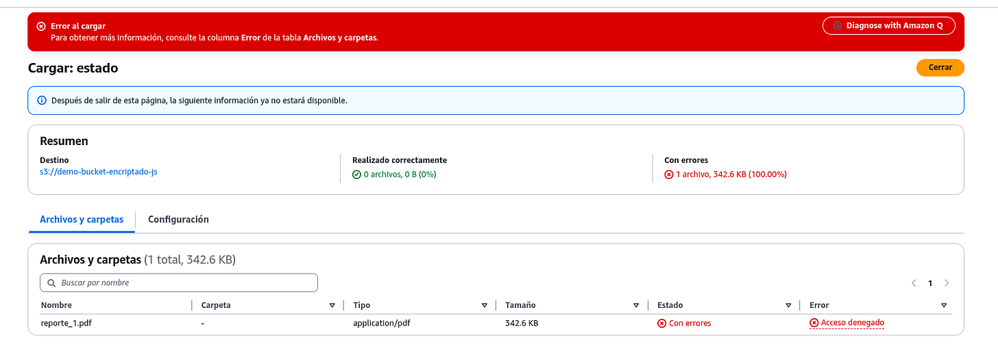 Luego de configurar la política, tratamos de subir un objeto y vemos que esta subida de archivos será bloqueada.