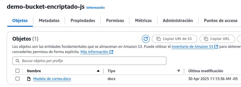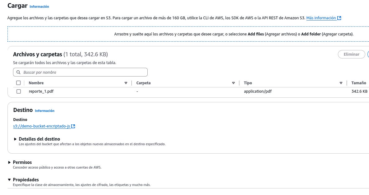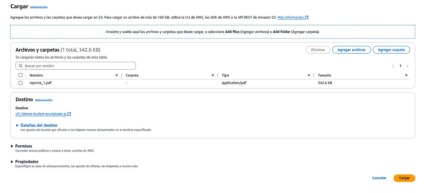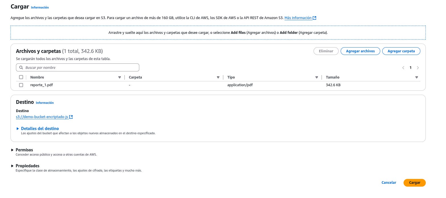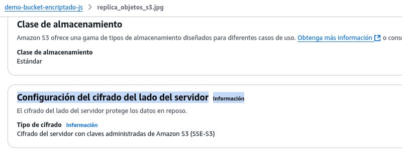 Si cargamos objetos al bucket, y seleccionamos dicho objeto, podremos ver que su método de encriptación es la misma que seleccionamos cuando el bucket fue creado.