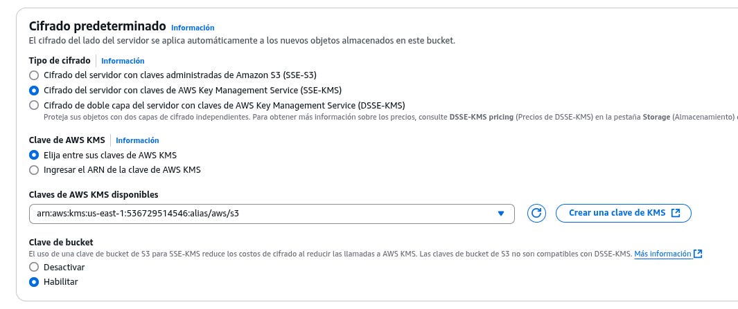 Al momento de crear un bucket, podemos seleccionar el tipo de encriptación de nuestro bucket. Con esto, todos los objetos heredarán esta encriptación.